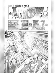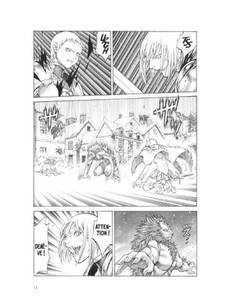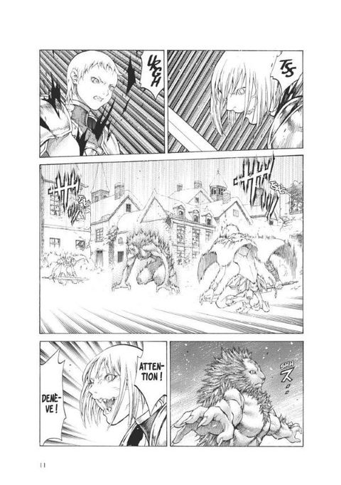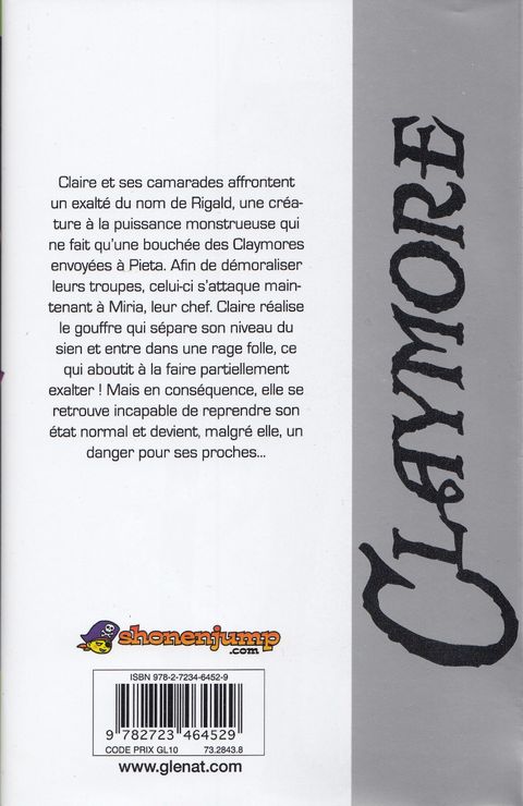 Claire et les autres affrontent le monstrueux Rigald, un exalté à l'apparence de lion qui cherche à supprimer Miria pour décourager les Claymores. Alors que tout espoir semble perdu, Claire parvient, à la surprise générale, à exalter une partie de son corps ! Le rapport de force s'inverse alors, mais malheureusement elle ne parvient plus à reprendre son état normal, et demande à ses amies de la supprimer. L'un des meilleurs mangas de fantasy du moment, et ce volume le prouve une nouvelle fois !