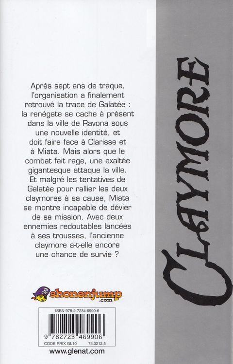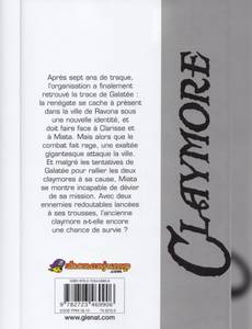 Clarisse doit faire équipe avec la redoutable Miata pour supprimer Galatée qui a trahi l'organisation depuis des années. Les deux guerrières arrivent dans la ville de Ravona dans laquelle s'est recluse l'ancienne numéro 3. À leur grande stupeur, celle-ci s'est volontairement crevée les yeux pour amplifi er sa capacité à percevoir l'énergie démoniaque ! Sans merci, le combat est brusquement interrompu par l'arrivée d'une exaltée gigantesque. Mais rien ne semble pouvoir détourner Miata de sa mission