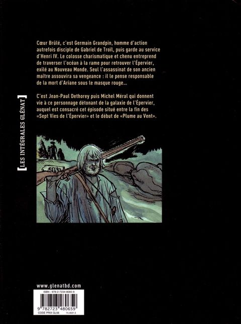 Coeur Brûlé, c'est Germain Grandpin, colosse charismatique, homme d'action au service du roi Henri IV (jusqu'à ce qu'il se fasse assassiner.). Il est surnommé ainsi par les Indiens d'Amérique du Nord : en effet, croyant qu'Ariane a été assassinée par son propre père, il a traversé l'Atlantique pour chercher Gabriel de Troïl dans les contrées sauvages du Canada.Plusieurs tomes de la série étant indisponibles depuis quelques temps, les amateurs des mythiques Sept Vies vont enfin avoir le plaisir de lire ou relire cet excellent "spin-off" qui suit l'un des personnages les plus détonants de la série. Dessinée par Dethorey puis par Michel Méral, cette série fait le lien entre la fin des Sept Vies de l'Épervier et le début de Plume au Vent.