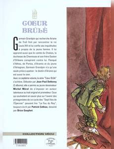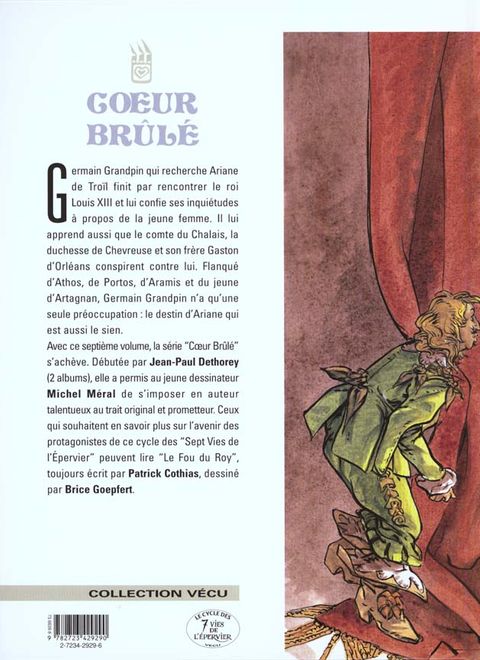 Germain Grandpin qui recherche Ariane de Troïl finit par rencontrer le roi Louis XIII et lui confie ses inquiétudes à propos de la jeune femme. Il lui apprend aussi que le comte du Chalais, la duchesse de Chevreuse et son frère Gaston d'Orléans conspirent contre lui. Flanqué d'Athos, de Portos, d'Aramis et du jeune d'Artagnan, Germain Grandpin n'a qu'une seule préoccupation : le destin d'Ariane qui est aussi le sien. Avec ce septième volume, la série Coeur Brûlé s'achève. Débutée par Jean-Paul Dethorey (2 albums), elle a permis au jeune dessinateur Michel Méral de s'imposer comme un auteur talentueux au trait original et prometteur. Ceux qui souhaitent en savoir plus sur l'avenir des protagonistes de ce cycle des Sept vies de l'Epervier peuvent lire le Fou du Roy , toujours écrit par Patrick Cothias, dessiné par Brice Goepfert.