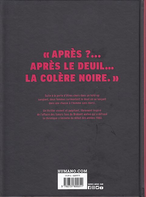 <div style="text-align: justify;">Après la perte d’êtres chers dans un hold-up sanglant, deux femmes surmontent le deuil en se lançant dans une chasse à l’homme sans merci. Quand les forces de l’ordre sont impuissantes, la colère devient le seul moyen d’avancer.Un thriller violent et palpitant, librement inspiré de l'affaire des tueurs fous du Brabant wallon, qui a défrayé la chronique criminelle du début des années 80.</div>