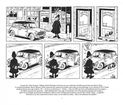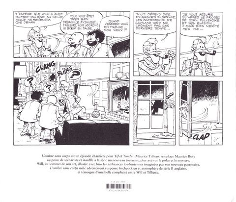 Tif et Tondu découvrent la cité brumeuse : Londres. Leur ami, l'inspecteur Ficshusset, est plongé jusqu'au cou dans une enquête mortelle et surnaturelle. Hors de question pour eux de le laisser seul dans cette aventure dont seul le flegme anglais sortira indemne. À l'instar de « La Pléiade » pour la littérature, cette collection propose de (re)découvrir une sélection des oeuvres incontournables de l'âge d'or de la bande dessinée franco-belge. Son format carré permet de lire l'oeuvre par demi-planches, telles qu'elles ont été conçues initialement par le dessinateur. Agrandies de 20 % par rapport à l'édition standard, restaurées et débarrassées de leur mise en couleurs, les planches noir et blanc se déploient dans toute leur puissance graphique. Commentées par Hugues Dayez, spécialiste reconnu de la bande dessinée de cette période, elles dévoilent aussi leur richesse et leurs secrets.