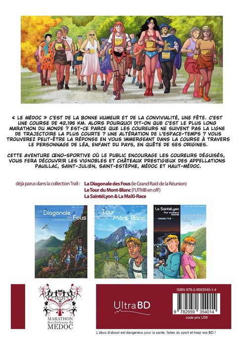 « Le Médoc » c’est de la bonne humeur et de la convivialité, une fête. C'est une course de 42,195 km alors pourquoi dit-on que c’est le plus long marathon du monde ? Est-ce parce que les coureurs ne suivent pas la ligne de trajectoire la plus courte ? Une altération de l’espace-temps ? Vous trouverez peut-être la réponse en vous immergeant dans la course à travers le personnage de Léa, enfant du pays, en quête de ses origines.Cette aventure œno-sportive où le public encourage les coureurs déguisés, vous fera découvrir les vignobles et châteaux prestigieux des appellations Pauillac, Saint-Julien, Saint-Estèphe, Médoc et Haut-Médoc.