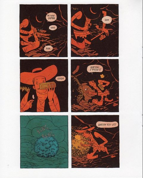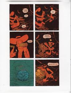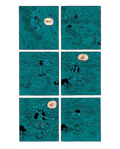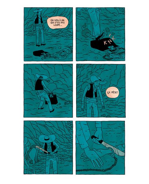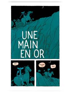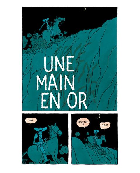 Un cow-boy aux manières frustes découvre un corps dans un ravin. L'homme semble mort, et à sa main est menotée une valise prometteuse. Couper la main ou couper la chaîne ? C'est le début des ennuis pour le pauvre héros de cette histoire de Far West. Très loin des mythiques justiciers de années 50', Une main en or est une fable sur l'avidité qui nous plonge sans préparation au coeur d'une histoire macabre, rude et chaotique comme le désert qui lui sert de décor. Le dessin maitrisé et élégant de Jordan Crane contraste avec la cruauté du récit et l'absence de finesse de son héros. De scène en scène, l'espace des cases se partage entre des noirs sans repli et des lavis monochromatiques tranchés : bleus, rouges, et oranges enferment le protagoniste dans une solitude sans clarté.