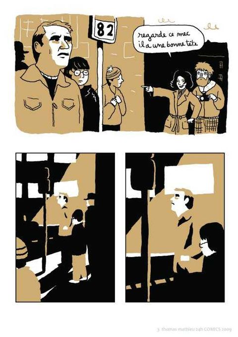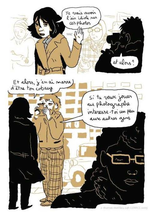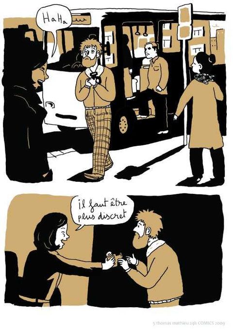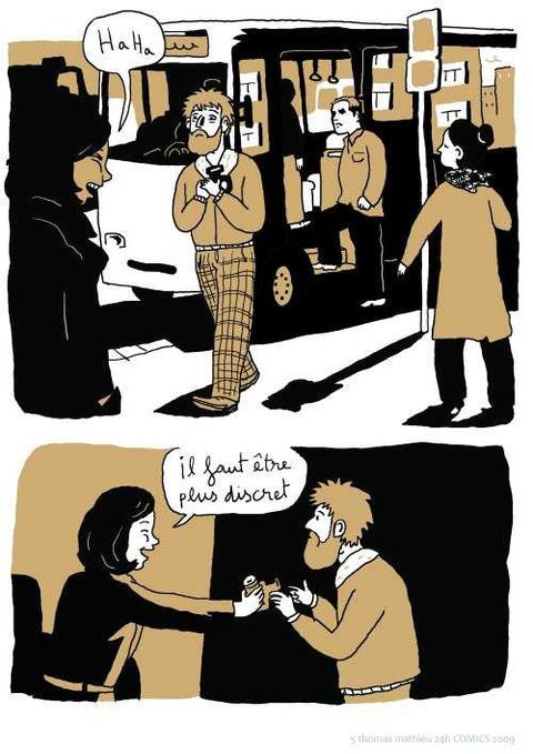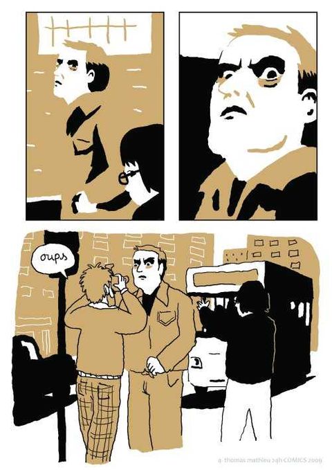 Quoi de plus plaisant qu’une promenade en amoureux le dimanche après-midi ? Monsieur s’adonne à la photo. En bon photographe amateur, il va choisir son modèle dans la rue avec l’aide de madame. Une fois qu’il l’à dans le viseur, il ne va plus le lâcher. Il va falloir user de méthodes dignes des meilleurs agents secrets. Ils vont le suivre partout tout. Mais si leur sujet était un dangereux criminel, un obsédé sexuel, un toxicomane ou bien pire encore : un psychopathe ? C’est avec un humour astucieux que Thomas Matthieu se livre à un étonnant jeu de piste avec ses deux personnages. Le type de la photo est une histoire prenante qui nous parle de voyeurisme et de ces jeux de l’imagination qui nous servent à transcender la banalité du quotidien. L’auteur a utilisé, pour son dessin, un logiciel de retouche photographique qui donne ce rendu graphique particulier et proche de la photographie.