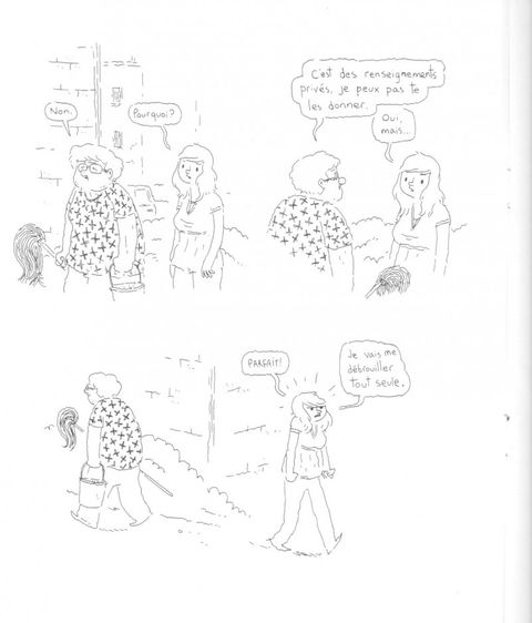 Autres illustrations Sandra, une jeune montréalaise, découvre que l'inquiétant personnage qui l'observe régulièrement depuis le sous-sol de son immeuble est en fait Pascal Girard, un auteur de bande dessinée de seconde zone. Après une recherche sur le net elle découvre un auteur "pas si pire" et décide d'en savoir plus sur ce personnage. Elle échafaude alors un plan pour inspecter la tanière du dessinateur. Mais à peine s'est-elle introduite dans l'appartement, que celui-ci revient inopinément. Récit pathétique et drôle de Girard, dans la lignée de son récent Conventum chez Delcourt, on retrouve son dessin fin et rond, tout en économie et efficacité, et qui contraste avec ce récit d'une mordante autodérision. Adoptant le point de vue de la jeune fille, il porte un regard sans concession sur lui-même, se transformant en son pire cauchemar : un auteur pathétique, ventripotent, solitaire et barbu, vivant dans un sous sol miteux.