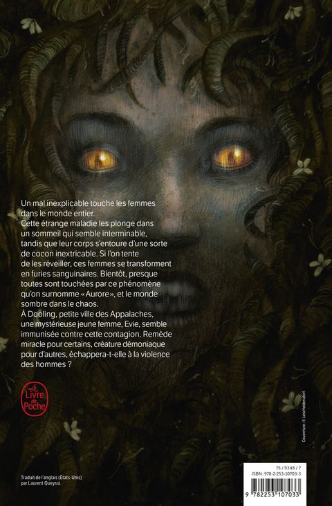 <div style="text-align: justify;">Un mal inexplicable touche les femmes dans le monde entier. Cette étrange maladie les plonge dans un sommeil qui semble interminable tandis que leur corps s’entoure d’une sorte de cocon inextricable. Si l'on tente de les réveiller, ces femmes se transforment en furies sanguinaires. Bientôt, presque toutes sont touchées par ce phénomène qu’on surnomme « Aurore » et le monde sombre dans le chaos. À Dooling, petite ville des Appalaches, une mystérieuse jeune femme, Evie, semble immunisée contre cette contagion. Remède miracle pour certain, créature démoniaque pour d’autres, échappera-t-elle à la violence des hommes ?Traduit de l’anglais (États-Unis) par Laurent Queyssi.</div>