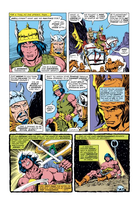 Des hommes-dragons ! Des faucons géants ! Un monstre-araignée ! Le Roi Ctesphon ! Conan affronte une foule de dangers, mais il ne sera pas toujours seul... il pourra parfois compter sur l'aide de Bêlit et Zula ! Les aventures de Conan se poursuivent inlassablement dans des épisodes qui n'avaient pas été réédités depuis les années 80. L'infatigable Roy Thomas est toujours aux commandes d'un album illustré par les meilleurs dessinateurs Marvel de l'époque !