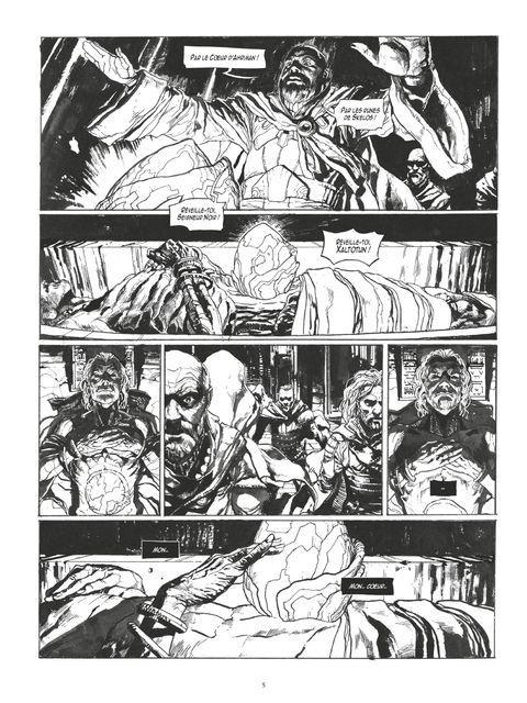 Unmondeà parcourir. Untrôneà reconquérir.Sous les voûtes funèbres du mausolée de l'antique et cruel Empereur Xaltotun de Python, trois hommes dévorés par l'ambition sont venus chercher la clé de leur pouvoir. Ils viennent offrir au corps inerte de l'ancien empereur le coeur d'Ahriman, source d'immortalité qui lui appartenait jadis et ne lui fut retiré qu'au prix de sa vie. En échange de cette offrande les trois hommes ne réclament qu'une chose de l'ancien empereur: le monde. Or, il n'existe qu'un seul être capable de leur barrer la route, un cimmérien s'étant emparé du trône d'Aquilonie: Conan. Au creux de la plaine de Valkia, les armées de Conan et de Xaltotun vont s'affronter. Menés par leur chef, les soldats du cimmérien croiront jusqu'au bout à leur victoire avant de faillir devant la puissance des incantations de Xaltotun. Dans sa chute, Conan entendra les cris de ses frères d'armes avant de reprendre ses esprits dans les geôles de l'ennemi... Mais même tombé aussi bas, même témoin de l'incommensurable force de l'ennemi, Conan se relèvera...Unique romanConande la bibliographie de Robert E. Howard,L'Heure du dragonest aujourd'hui adapté en BD par deux pontes del'heroicfantasy: Julien Blondel et Valentin Sécher. Au fil des planches virtuoses d'un album chargé du souffle de la légende, les deux auteurs reconstituent une aventure grandiose, épique et sanguinaire.