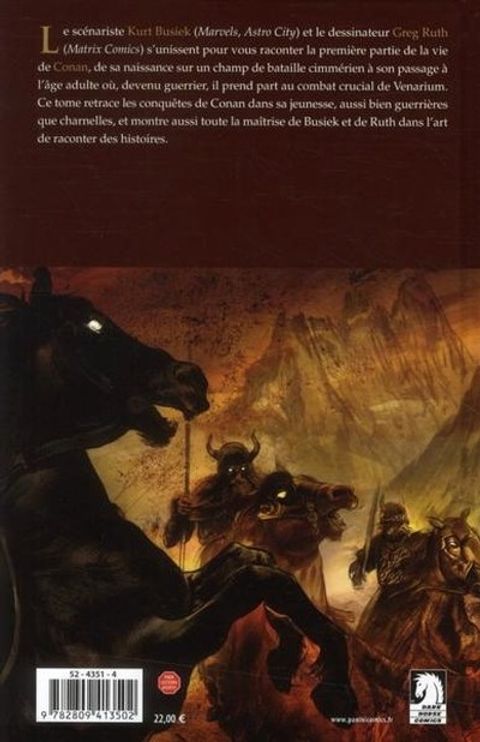 Parallèlement aux anciennes aventures de Conan, Panini Comics poursuit la publication de la récente série éditée par Dark Horse. Dans cet album, c'est au tour de Kurt Busiek (Marvels, Thunderbolts, Superman.) et de Greg Ruth de s'occuper du célèbre barbare. Au menu : la jeunesse du héros, de sa naissance sur un champ de bataille jusqu'à son implication dans la guerre de Venarium.