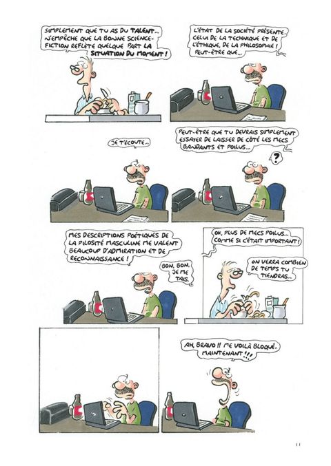 Conrad roule les yeux lorsqu’il entend Paul lui raconter l’histoire de son nouveau livre de science-fiction... Souvenez-vous : à la fin de Une station spatiale nommée désir, le héros de l’espace Barry Rouston fonçait à bord de son bombardier chargé à la testostérone dans les coins les plus reculés du cosmos. Sauf que la folie ne fait que commencer ! Car une étrange singularité plonge maintenant Barry dans un avenir lointain où se trouvent des aliens lubriques et des rats boueux mais pas la moindre trace d’hommes velus ! Ce n’est que lorsqu’il atteint les dessous de la ceinture de la planète Prépuce que Barry constate, soulagé, que l’univers n’a pas fini de grogner. Pas de doute, Barry Rouston plonge la littérature de SF dans des abysses qu’elle n’avait encore jamais explorés !