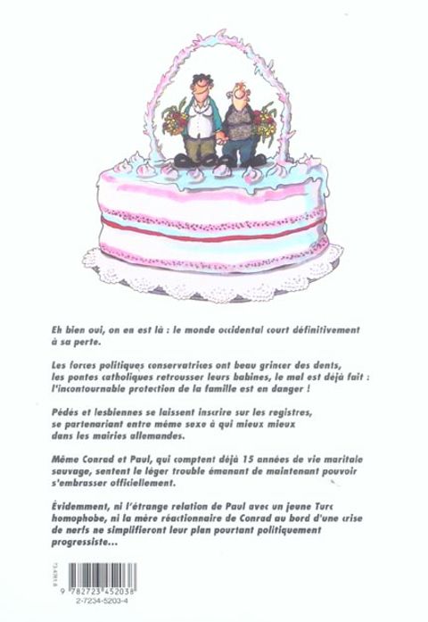 Certains reprochent aux personnages de Ralf König d'avoir leurs testicules à la place du cerveau. Il faut bien admettre qu'ils sont pour la plupart sujets à des obssessions récurrentes et que quelques vilaines poussées hormonales bouleversent régulièrement leurs reflexions, mais bon! Ne vaudrait-il pas mieux inverser la "transplantation" et dire que les personnages de Ralf König ont un cerveau à la place de testiculesoe Pour une fois notre ami Ralf Kônig nous déjoue. Il est question de mariage, de mariage homosexuel. Sujet qui a alimenté la presse l'été dernier. C'est sur ce sujet tabou que König a décidé de s'attaquer avec tout l'humour et la dérisions qu'on lui connait. C'est une oeuvre à part dans sa bibliographie. Très moqueur, il broquarde les Ayatollahs de la cause...