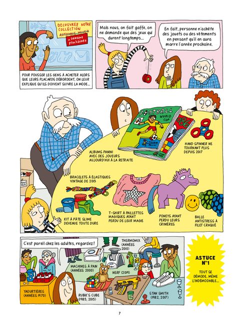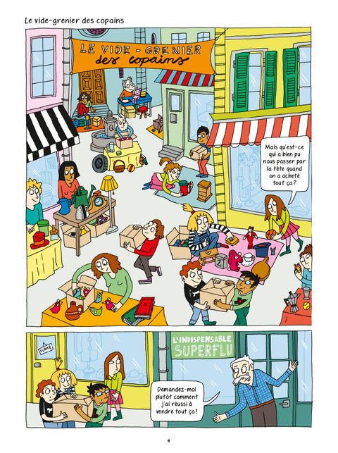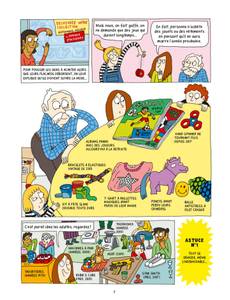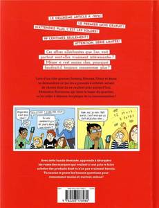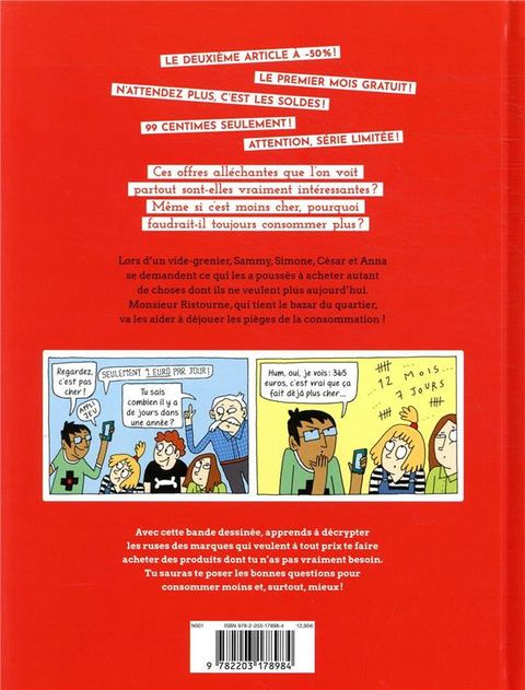 Lors d'un vide-grenier, 4 enfants d'une dizaine d'années se questionnent sur leurs habitudes de consommation. M. Ristourne, qui tient un bazar depuis toujours, va les aider à décrypter les pièges que tendent les marques à leurs clients pour leur faire acheter sans cesse des produits dont ils n'ont pas besoin. Le lecteur découvre pourquoi la mode est un prétexte à la consommation, pourquoi les prix se terminent par "9" , comment les jeux sur applis incitent à dépenser, ce que sont le green washing et le gender marketing, comment démystifier les soldes et autres promotions trompeuses... Au total, une vingtaine de saynètes et autant d'astuces efficaces pour se poser les bonnes questions avant de consommer.