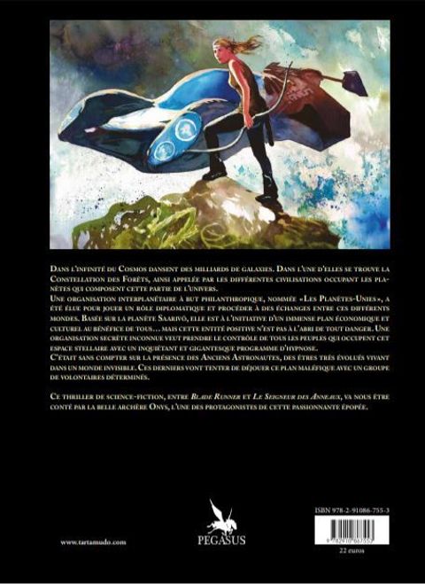 Dans l'immensité de l'univers se trouve la Constellation des Forêts ; au sein de laquelle des civilisations s'organisent autour de la congrégation des Astres Unis. Depuis la révélation de l'existence des Anciens Astronautes, une grande agitation s'est répandue parmi les habitants de la planète La Plaine qui en fait partie. Ces derniers sont des sages mythiques, qui viennent de zones lointaines perdues dans le cosmos. L'une des technologies essentielles de ces êtres exceptionnels a été dérobée. Par qui, nul ne le sait au moment où commence cette quête. Un réseau inconnu, situé dans une galaxie voisine, semble vouloir utiliser ce savoir remarquable pour manipuler à distance l'esprit des peuples qui demeurent dans les communautés qui composent cette congrégation. Pour les héros de cette aventure, la jeune et téméraire archère Onys, le courageux capitaine Mark et la chamane mystérieuse Yulunga, il faudra traverser l'espace et visiter bien des planètes au cours de nombreuses péripéties étonnantes. Peut-être parviendront-ils à démasquer les puissants coupables. Un roman graphique plein d'action à travers une odyssée qui oscille entre espionnage, fantasy et science-fiction.