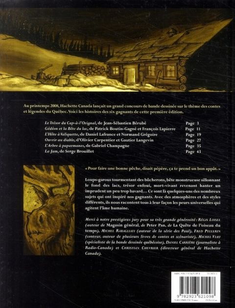 Au printemps 2008, hachette canada lançait un grand concours de bande dessinée sur le thème des contes et légendes du québec. Voici les histoires des six gagnants de cette première édition. "pour faire une bonne pêche, disait pépère, ça te prend un bon appât" loups-garous tourmentant des bûcherons, bête monstrueuse sillonnant le fond des lacs, trésor enfoui, mort-vivant revenant hanter un imprudent un peu trop bavard. ce sont là quelques-uns des nombreux sujets qui ont inspiré nos gagnants. avec des atmosphères et des styles différents, ils nous racontent tous à leur façon les peurs universelles qui agitent l'âme humaine.