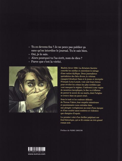 Madrid, hiver 1956. La dictature fasciste contrôle les médias et entretient le mirage d'une nation idyllique. Deux journalistes spécialistes des faits divers, le vétéran espagnol désabusé Sanz et le jeune et intrépide Français Léon Lenoir, vont unir leurs forces pour révéler les crimes les plus sordides que veut masquer le régime. Confronté à une vague de meurtres inexpliqués, le duo va s'efforcer de percer le secret de ces morts, dont l'origine se trouve dans un passé cruel. Sous le trait et les couleurs délicats de Teresa Valero, leur enquête minutieuse et passionnante nous entraîne dans une plongée vertigineuse au cœur d'une époque et d'une société aussi sombres et violentes que chargées d'espoir. Le premier volet d'un thriller palpitant sur fond historique, qui se lit comme un très grand roman noir.