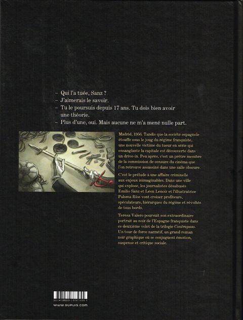 Madrid, 1956. Le régime du général Franco censure le cinéma espagnol et impose sa propre version de l'histoire… Dans ce contexte de répression, les journalistes Sanz, le vieux phalangiste désabusé, et Lenoir, l'idéaliste admirateur d'Albert Camus, croisent le chemin du tueur en série que traque Sanz depuis des années. Mais cette fois, sa 17e victime est retrouvée assassinée dans un cinéma en plein air... Nos deux journalistes comprennent vite que ce meurtre à la mise en scène macabre cache un message…Dans cette deuxième partie de la trilogie Contrapaso, Teresa Valero nous plonge dans le milieu du cinéma espagnol des années 1950, écrasé par le régime, à l'heure même où Hollywood investit l'Espagne pour y tourner ses superproductions... Complémentaires, dissemblables et attachants, Sanz et Lenoir vont mener une nouvelle enquête de choc au cœur des heures noires de l’Espagne franquiste. Un chef-d'œuvre du roman noir graphique pour le nouveau label Aire Noire.