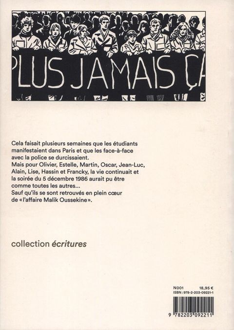 Paris, le 6 décembre 1986. Suite une manifestation estudiantine contre le projet de réforme universitaire du ministre délégué Alain Devaquet une tragique bavure policière entraîne la mort de Malik Oussekine, jeune étudiant de 22 ans. A la suite de cette tragédie, Devaquet présente sa démission. 30 ans après Jeanne Puchol et Laurent-Frédéric Bollée ravivent notre attention sur cet événement très médiatisé, qui aujourd'hui encore trouve des retentissements dans une France en proie à de nombreux troubles sociaux.