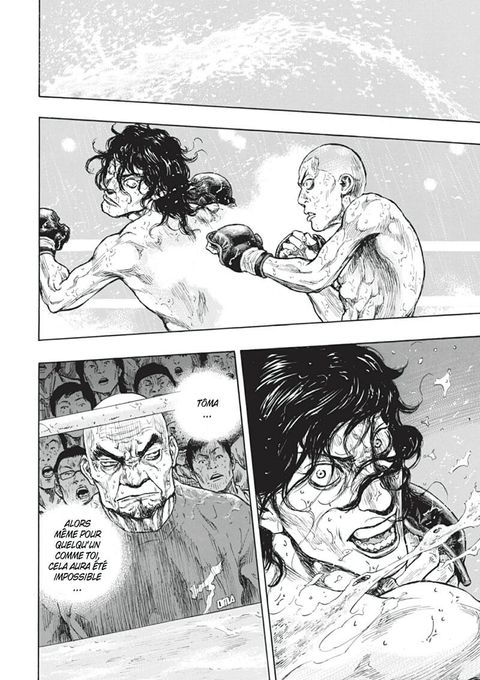 Une tempête à l'approche électrise la violence entre Ryô et Tôma, plus déchaînés que jamais. Se rendant coups pour coups, ils sont tous les deux sur le point de craquer. Physiquement pour l'un, mentalement pour l'autre. Mais le destin s'en mêle et un orage fait sauter l'électricité du stade. Les deux combattants pourront-ils s'affronter dans ces ténèbres qui semblent poursuivre Ryô à jamais ?