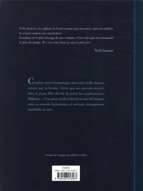 Coraline vient d'emménager dans une étrange maison et, comme ses parents n'ont pas le temps de s'occuper d'elle, elle décide de jouer les exploratrices. Ouvrant une porte condamnée, elle pénètre dans un appartement identique au sien. Identique, et pourtant... Dans la droite ligne d'Alice au pays des merveilles, ce roman à l'atmosphère inoubliable a déjà conquis des millions de lecteurs. Roman illustré, à partir de 13 ans