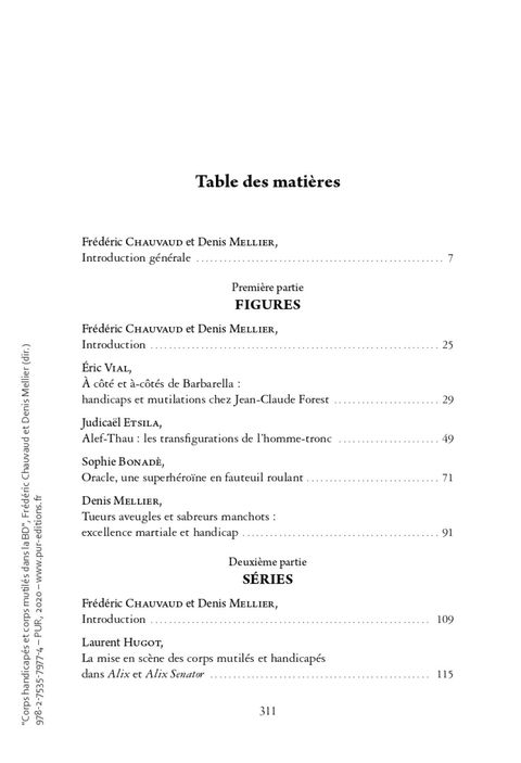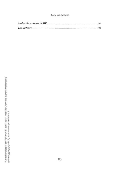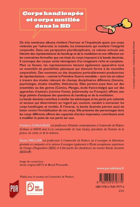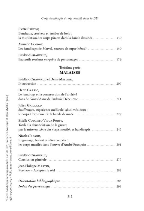 De très nombreux albums révèlent l'horreur et l'inquiétude quant aux corps violentés par l'adversité, la maladie, les événements qui mutilent l'intégrité corporelle. Ce volume articule une histoire des représentations du handicap et de la mutilation et une réflexion sur les contraintes formelles que ces états du corps imposent à la bande dessinée. Il convoque des corpus variés témoignant d'un imaginaire riche et complexe. Mais ce faisant, les représentations laissent également apparaître tout un ensemble de possibilités plastiques qui donnent forme à de nouvelles corporalités. Des moments ou des situations particulièrement productrices de représentations – comme la première guerre mondiale – sont mises en valeur à travers des études relevant de champs disciplinaires différents (histoire, psychologie, études visuelles, littérature). Elles portent aussi bien sur des ensembles ou des genres (Comics, Mangas, école franco-belge) que sur des approches d'auteurs (comme Forest, Jodorowsky ou Franquin) offrant une large palette d'analyses des questions du handicap et de la mutilation. La bande dessinée contribue à révéler les stéréotypes et les partis pris culturels et sociaux qui déterminent un regard qui, souvent, conduit à ostraciser les corps handicapés et mutilés. A l'inverse, la bande dessinée permet aussi de lutter contre l'invisibilisation de ces corps. Elle présente des personnages dont les corps différents offrent des capacités d'action impensées, contribuant ainsi à modifier le point de vue porté sur eux.