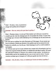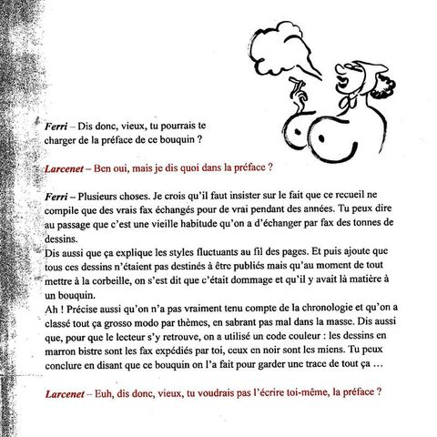 Larcenet ? Bin oui, je dis quoi dans la préface ? Ferri ? Plusieurs choses. Je crois qu'il faut insister sur le fait que ce recueil ne compile que des vrais faxs échangés pour de vrai pendant des années. Tu peux conclure en disant que ce bouquin on l'a fait pour garder une trace de tout ça...