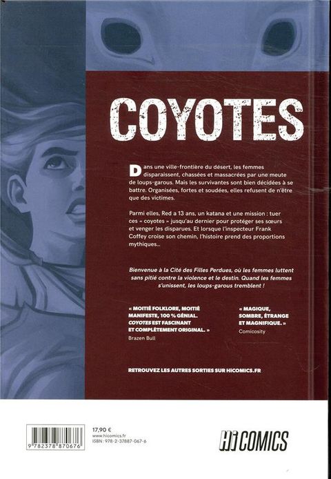 Dans une ville-frontière du désert, les femmes disparaissent, chassées et massacrées par une meute de loups garous... qui ne sont autres que les hommes de la ville. Les survivantes sont bien décidées à se battre. Organisées, fortes et soudées, elles refusent de n'être que des victimes.Parmi elles, Red a 13 ans, un katana et une mission : tuer ces « coyotes » jusqu'au dernier pour protéger ses soeurs et venger les disparues. Et lorsque l'officier Frank Coffey croise son chemin, l'histoire prend des proportions mythiques... Kill Bill meets Underworld ! « Magique, sombre, étrange et magnifique. » Comicosity « Moitié folklore, moitié manifeste, 100 % génial. Coyotes est fascinant et complètement original dans le meilleur sens possible du terme. » Brazen Bull