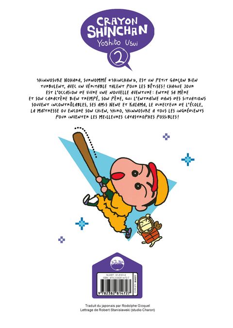 Shinnosuke Nohara, surnommé « Shinchan », est un petit garçon bien turbulent, avec un véritable talent pour les bêtises ! Chaque jour est l'occasion de vivre une nouvelle aventure : entre sa mère et son caractère bien trempé, son père, qui l'entraîne dans des situations souvent incontrôlables, ses amis Nene et Kazama, le directeur de l'école, la maîtresse ou encore son chien, Shiro, Shinnosuke a tous les ingrédients pour inventer les meilleures catastrophes possibles !Découvrez la série culte de Yoshito Usui dans une toute nouvelle réédition, au sein de la collection Kôten. D'abord publié aux éditions Futabasha et adapté en animé, Crayon Shinchan est une oeuvre humoristique et universelle de renommée internationale.