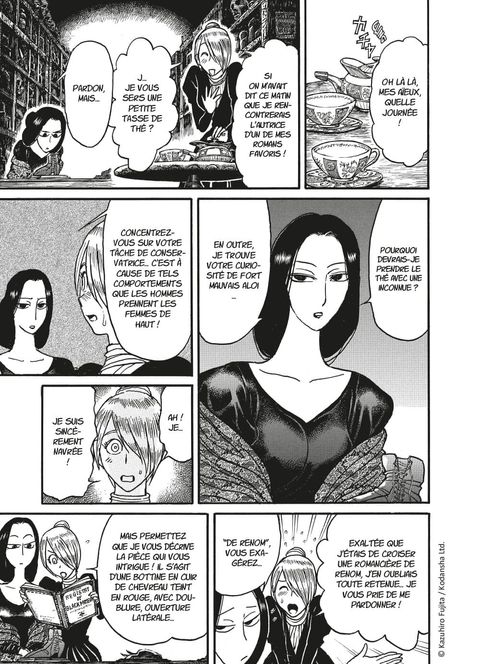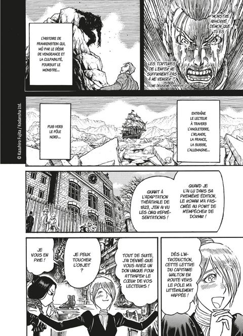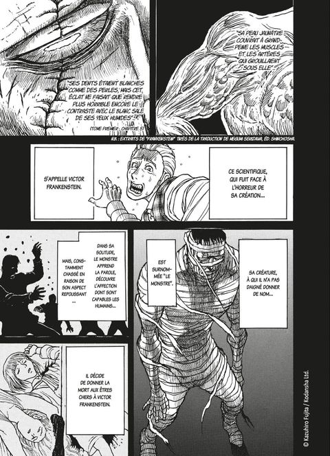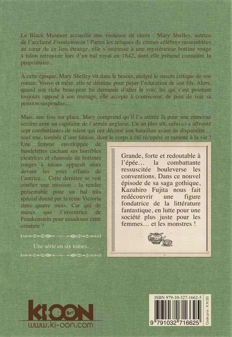 Mary Shelley face à la créature de Frankenstein... au féminin ! Le Black Museum accueille une visiteuse de choix : Mary Shelley, autrice de l'acclamé Frankenstein ! Parmi les reliques de crimes célèbres rassemblées au cœur de ce lieu étrange, elle s'intéresse à une mystérieuse bottine rouge à talon retrouvée lors d'un bal royal en 1842, dont elle prétend connaître la propriétaire... À cette époque, Mary Shelley vit dans le besoin, malgré le succès critique de son roman. Veuve et mère, elle se démène pour payer l'éducation de son fils. Alors, quand son riche beau-père lui demande d'aller le voir, lui qui s'est pourtant toujours opposé à son mariage, elle accepte à contrecœur, de peur de voir sa pension suspendue... Mais, une fois sur place, Mary comprend qu'il l'a attirée là pour une entrevue secrète avec un capitaine de l'armée anglaise. Un an plus tôt, celui-ci a affronté sept combattantes de talent qui ont décimé son bataillon avant de disparaître... sauf une, tombée d'une falaise, dont le corps a été récupéré et ramené à la vie ! Une femme enveloppée de bandelettes cachant ses horribles cicatrices et chaussée de bottines rouges à talons apparaît alors devant les yeux effarés de l'autrice... Cette dernière se voit confier une mission : la rendre présentable pour un bal très spécial donné par la reine Victoria dans quatre mois. Car qui de mieux que l'inventrice de Frankenstein pour amadouer cette créature ? Grande, forte et redoutable à l'épée... la combattante ressuscitée bouleverse les conventions. Dans ce nouvel épisode de sa saga gothique, Kazuhiro Fujita nous fait redécouvrir une figure fondatrice de la littérature fantastique, en lutte pour une société plus juste pour les femmes... et les monstres !