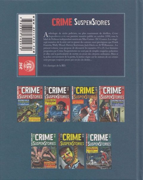 Anthologie de récits policiers, ou plus exactement de thrillers, Crime SuspenStories a vu son premier numéro publié en octobre 1950, sous le label de l’éditeur indépendant américain William Gaynes : EC Comics. Vingt-sept numéros seront publiés en tout et des auteurs comme Frank Frazetta, Wally Wood, Harvey Kurtzman, Jack Davis, Al Williamson… collaboreront plus ou moins régulièrement à l’aventure. Les histoires proposées mettent rarement en avant des policiers ou des détectives privés et on y voit plutôt des crimes dont les auteurs sont punis par un jeu du destin.