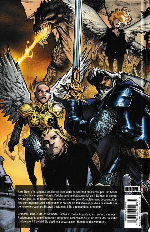 Le retour tant attendu d'une série culte ! Alex Elder a le sang qui bouillonne : ses amis se sont fait massacrer par une bande de motards vampires ! Mordu, l'adolescent ne doit son salut qu'à Ekimus, le dernier des Gregori, qui le transforme à son tour en vampire. Complètement déboussolé et ivre de vengeance, Alex apprend de la bouche de son sauveur qu'il n'a pas hérité que de nouvelles canines. Il serait également l'Élu d'une antique prophétie... Crimson, série culte d'Humberto Ramos et Brian Augustyn, est enfin de retour ! Revivez, pour la première fois en intégralité, l'ascension du jeune Alex Elder du statut d'adolescent à celui d'Élu destiné à débarrasser l'humanité des vampires.