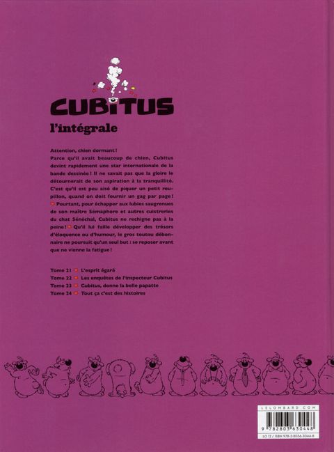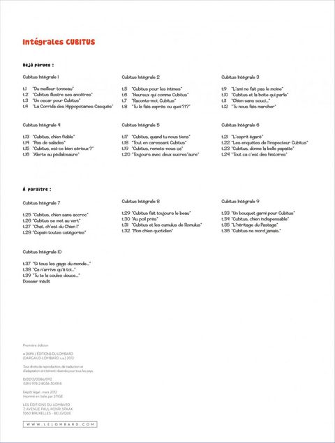Ce n'est pas parce que Bidule est à l'honneur dans les pages nouveautés que l'on doit pour autant oublier son illustre parent, le débonnaire et volubile Cubitus ! Le Lombard poursuit la réédition intégrale de l'oeuvre majeure de Dupa. À l'instar de son maître et ami, Greg, l'auteur de Cubitus possédait ce don du gag en une page, porté aussi bien par un dynamisme visuel de tous les instants que par une verve jamais tarie. Ces quatre albums en attestent une fois de plus ! Et ce n'est que le début...