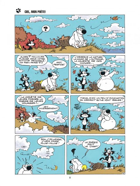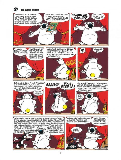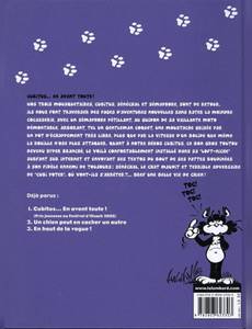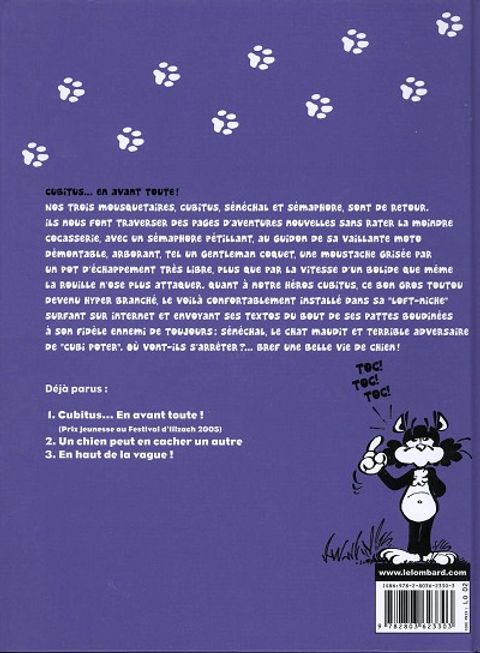 Nos trois mousquetaires, cubitus, sénéchal et sémaphore, sont de retour. Ils nous font traverser des pages d'aventures nouvelles sans rater la moindre cocasserie, avec un sémaphore pétillant, au guidon de sa vaillante moto démontable, arborant, tel un gentleman coquet, une moustache grisée par un pot d'échappement très libre, plus que par la vitesse d'un bolide que même la rouille n'ose plus attaquer. quant à notre héros cubitus, ce bon gros toutou devenu hyper branché, le voilà confortablement installé dans sa "loft-niche" surfant sur internet et envoyant ses textos du bout de ses pattes boudinées à son fidèle ennemi de toujours : sénéchal, le chat maudit et terrible adversaire de "cubi poter". Où vont-ils s'arrêter ?... bref une belle vie de chien !