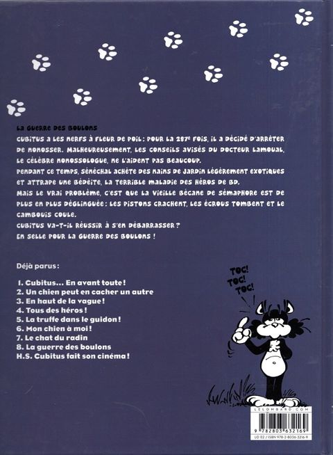 Cubitus a les nerfs à fleur de poil : pour la 287e fois, il a décidé d'arrêter de nonosser. Malheureusement les conseils avisés du docteur Lamoual, le célèbre nonossologue, ne l'aident pas beaucoup. Pendant ce temps, Sénéchal achète des nains de jardin légèrement exotiques et attrape une bédéïte, la terrible maladie des héros de BD. Mais le vrai problème, c'est que la vieille bécane de Sémaphore est de plus en plus déglinguée : Les pistons crachent, les écrous tombent et le cambouis coule. Cubitus va t-il réussir à s'en débarrasser ? En selle pour la guerre des boulons !