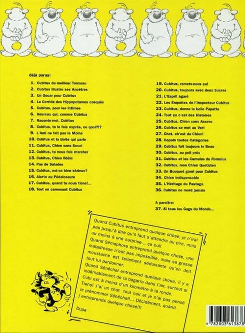 Le gros toutou le plus sympa de la BD a 30 ans ! Il n'en a pas pris une ride de plus pour autant... Quand Cubitus entreprend quelque chose, on ne peut aller jusqu'à dire qu'il faut s'attendre au pire, mais au moins à une surprise... Ça oui ! Quand Sémaphore entreprend quelque chose, une maladresse n'est pas impossible, mais sa grosse moustache est tellement séduisante qu'on doit tout lui pardonner. Quand Sénéchal entreprend quelque chose, il y a inévitablement de la bagarre dans l'air, surtout si Cubitus est à moins d'un kilomètre à la ronde... «Tiens, constate Dupa, j'ai un chat noir et je n'ai pas pensé à le prénommer Sénéchal... Décidément, quand j'entreprends quelque chose !!!»