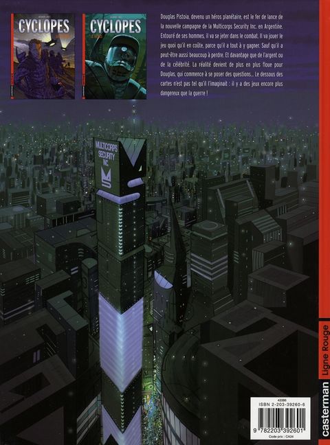 Douglas Pistoia est un soldat d'un genre nouveau. Sur le front de la première guerre privée, Multicorps lnc. rentabilise ses opérations militaires en les diffusant en direct, filmées par les soldats eux-mêmes, surnommés les Cyclopes. Douglas, mercenaire photogénique et courageux, sort du lot. Cynique, il joue le jeu. les Cyclopes conquièrent les victoires et les foules. l'argent coule à flots. Mais la machine se détraque... Douglas va-t-il mordre la main qui le nourrit grassement ? Un suspense futuriste implacable, en quatre volumes, par les auteurs de " Le Tueur ".