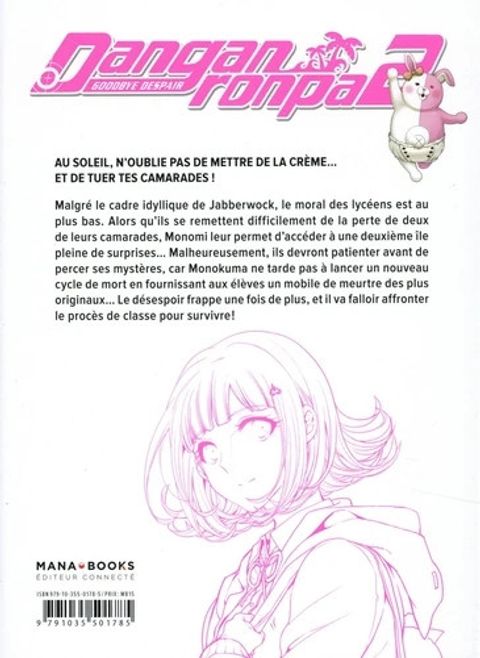 L'adaptation du jeu culte de Spike Chunsoft enfin en France ! Au soleil, n'oublie pas de mettre de la crème solaire et de tuer tes camarades ! A Kibôgamine, l'école réservée à l'élite des lycéens, l'heure est au voyage scolaire ! Sur l'île paradisiaque de Jabberwock, Hajime Hinata et ses camarades profitent de la plage et du beau temps... Mais voilà que Monokuma, la peluche psychopathe, est de retour et met en place un nouveau jeu de la mort : quiconque voudra quitter l'île devra commettre un meurtre ! Qui parmi les élèves sera le premier à mourir ?