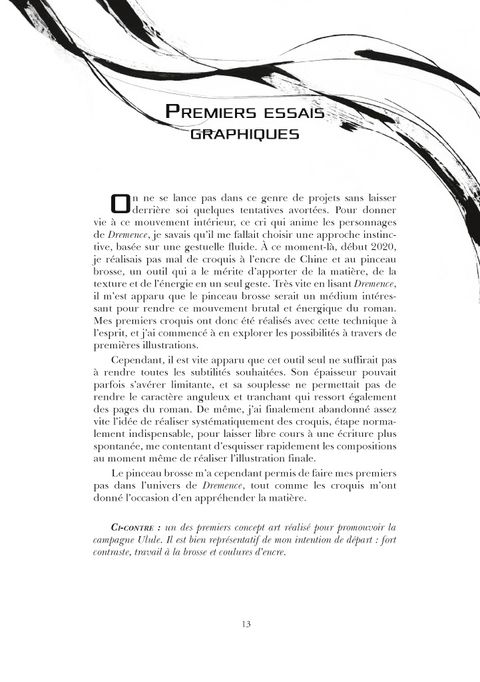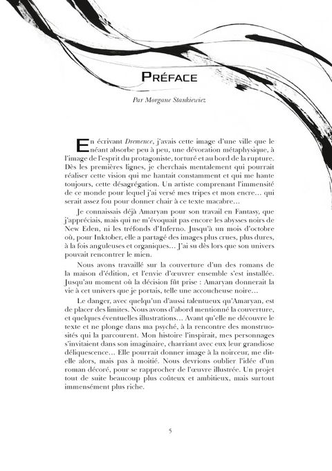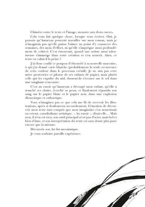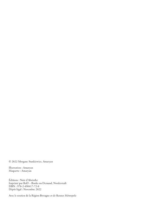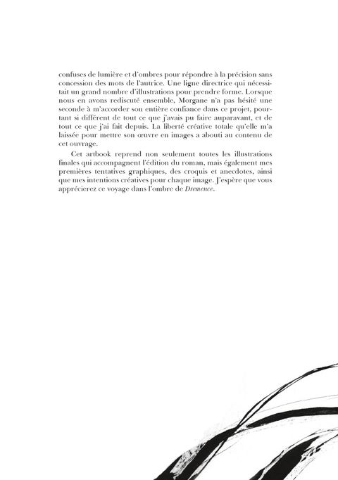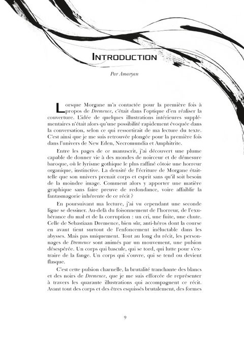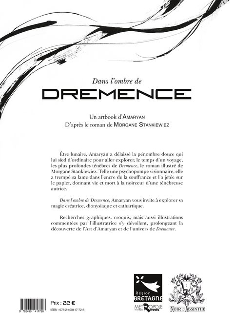 Être lunaire, Amaryan a délaissé la pénombre douce qui lui sied d'ordinaire pour aller explorer, le temps d'un voyage, les plus profondes ténèbres de Dremence, le roman illustré de Morgane Stankiewiez. Telle une psychopompe visionnaire, elle a trempé sa lame dans l'encre de la souffrance et l'a jetée sur le papier, donnant vie et mort à la noirceur d'une ténébreuse autrice. Dans l'ombre de Dremence, Amaryan vous invite à explorer sa magie créatrice, dionysiaque et cathartique. Recherches graphiques, croquis, mais aussi illustrations commentées par l'illustratrice s'y dévoilent, prolongeant la découverte de l'Art d'Amaryan et de l'univers de Dremence.