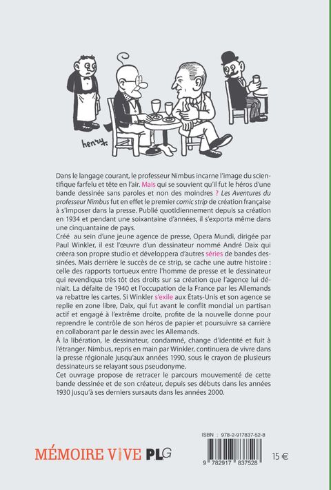 Dans le langage courant, le professeur Nimbus incarne l'image du scien- tifique farfelu et tête en l'air. Mais qui se souvient qu'il fut le héros d'une bande dessinée sans paroles et non des moindres ? Les Aventures du professeur Nimbus fut en effet le premier comic strip de création française à s'imposer dans la presse. Publié quotidiennement depuis sa création en 1934 et pendant une soixantaine d'années, il s'exporta même dans une cinquantaine de pays. Créé au sein d'une jeune agence de presse, Opera Mundi, dirigée par Paul Winkler, il est l'oeuvre d'un dessinateur nommé André Daix qui créera son propre studio et développera d'autres séries de bandes des- sinées. Mais derrière le succès de ce strip, se cache une autre histoire : celle des rapports tortueux entre l'homme de presse et le dessinateur qui revendiqua très tôt des droits sur sa création que l'agence lui dé- niait. La défaite de 1940 et l'occupation de la France par les Allemands va rebattre les cartes.