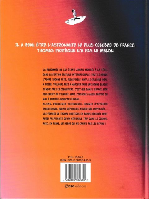 Thomas Pastèque est à Thomas Pesquet ce que Austin Powers est à James Bond. Il était temps de se moquer franchement de l'icône dont on nous rabâche quotidiennement les oreilles. En 56 pages, l'équipe de chez Makma déboulonne, grâce à notre héros Pastèque, le spationaute français. Nous y retrouverons : des aliens très verts, d'intrépides spationautes féminines et nous croiserons même les doubles virtuels de jumeaux venus d'un temps X. Humour et gags sont au rendez-vous de ce pastiche qui nous emmène à bord d'une station spatiale improbable.