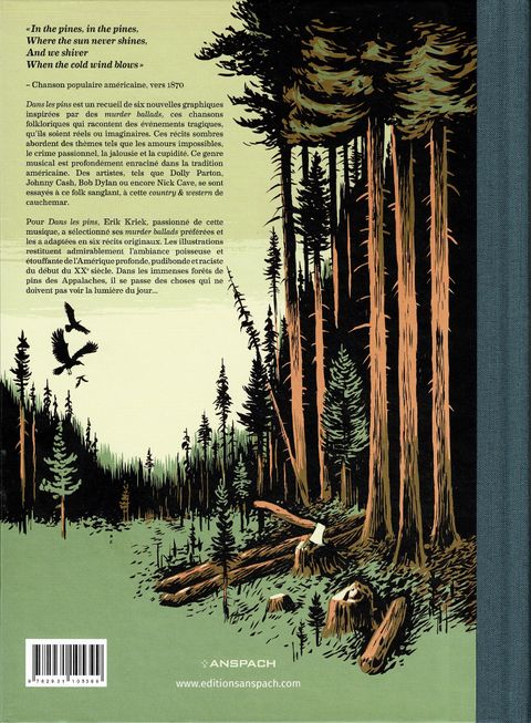 Dans les pins , fort justement sous-titré Ballades Meurtrières , propose 6 histoires courtes à vous glacer le sang. Elles se déroulent toutes dans l’Amérique profonde des années 1920, un temps où les armes et la religion faisaient la loi. Une époque où ils ne faisaient pas bon vivre pour les pauvres, les noirs et les femmes… Les Murder Ballads sont une composante importante de la musique populaire américaine et un sous-genre de la ballade traditionnelle. Leurs paroles ont toujours un meurtre (et ses conséquences pour leur auteur) comme thème. Erik Kriek a choisi six de ces chansons, dessinées dans son style inimitable, chargé de tension et de cauchemar, pour en faire des œuvres originales qui n’appartiennent qu’à lui. La postface érudite et passionnante de Jan Donkers explique la genèse de chaque titre, en le remettant dans son contexte et en en expliquant l’origine et les (nombreux) interprètes qui l’ont popularisé.