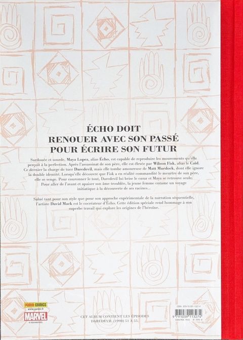 Maya Lopez, surnommé Écho par les journaux, est une jeune femme malentendante capable d'imiter tout ce qu'elle voit et en particulier, les styles de combat. Quand le Caïd l'a convaincue que Daredevil avait assassiné son père, elle a bien failli tuer l'Homme Sans Peur. Maintenant qu'elle a découvert la vérité, voilà qu'elle quitte New York pour une quête spirituelle, qui doit lui permettre de reconstituer sa vie brisée. Ce personnage charismatique qui a fait son apparition dans le Marvel Cinematic Universe à l'occasion de la série Hawkeye, sous les traits d'Alaqua Cox, doit être l'héroïne d'une nouvelle série Disney+ dont tous les épisodes sortiront le 29 novembre. L'occasion idéale pour proposer une édition ultime de sa saga la plus emblématique, servie par l'imaginaire onirique de David Mack (Kabuki) !