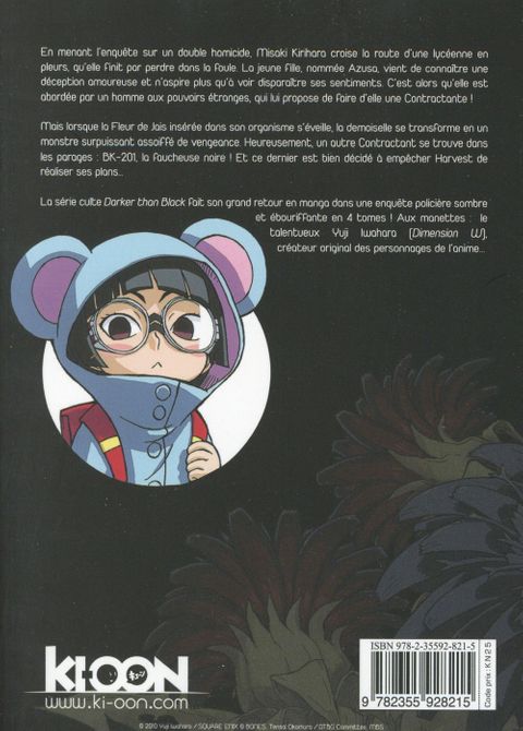 Voilà 10 ans maintenant qu'un champ de force d'origine inconnue, le Hell's Gate, s'est dressé autour de Tokyo. Ce mystérieux bouleversement s'est accompagné de la mutation de nombreux humains en êtres dotés de pouvoirs surnaturels, les Contractants. Ces implacables machines à tuer sont souvent employées illégalement par certaines organisations mafieuses, voire quelques organismes d'État, pour s'acquitter des basses besognes... Si leur existence reste une rumeur pour le grand public, c'est en partie grâce à la Section 4, une brigade d'élite créée dans le but de surveiller et d'appréhender les Contractants pour empêcher leur circulation au sein de la société civile... Pour Misaki Kirihara, jeune et brillante capitaine de la Section 4, les dernières semaines n'ont pas été de tout repos : un mystérieux Contractant erre dans les rues de Tokyo et dupe ses victimes, des humains au bord du suicide, en leur proposant de les aider dans leur quête de vengeance. La série culte Darker than Black fait son grand retour en manga dans une enquête policière sombre et ébouriffante en 4 tomes ! Aux manettes : le talentueux Yuji Iwahara (Dimension W), créateur original des personnages de l'anime...