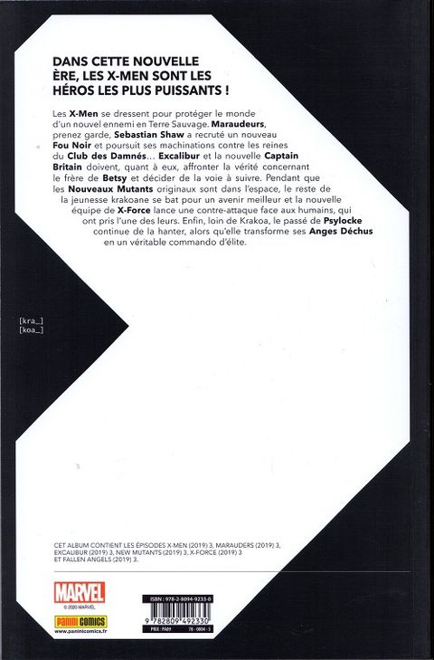 Branle-bas de combat chez les X-Men alors qu'un nouvel adversaire apparaît en Terre Sauvage. La nouvelle équipe X-Force se charge de récupérer l'un des leurs, capturé par les humains. Sebastian Shaw fait une nouvelle recrue. Du côté d'Excalibur, Captain Britain doit accepter la vérité sur son frère, tandis qu'Apocalypse et Rictor tentent de contrôler le phare de l'équipe, qui grandit de plus en plus. Psylocke est hantée par son passé. Quant aux Nouveaux Mutants, ils s'efforcent de rallier les jeunes mutants qui ont choisi de ne pas venir habiter sur Krakoa. X-Men, X-Force, Marauders, Excalibur, Fallen Angels, New Mutants. Six séries, six ambiances pour le relaunch tant attendu de l'univers mutant, proposé en France en format broché et cartonné ! Un nouveau concept éditorial pour les séries les plus récentes de l'univers mutant. Il fallait bien ça pour fêter la saga événement orchestrée par Jonathan Hickman !