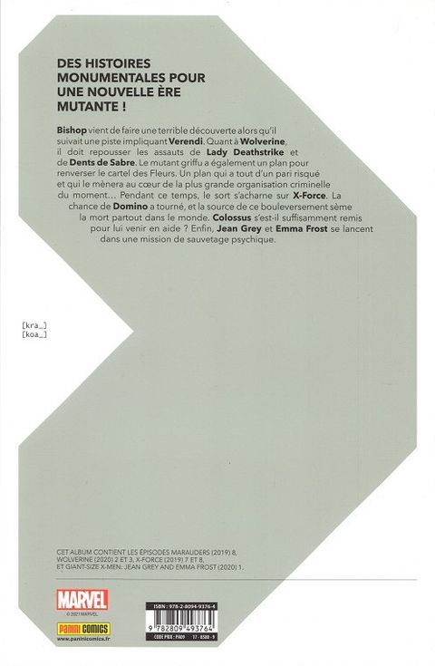 A la fin de House of M, la Sorcière Rouge prononçait ces mots fatidiques : "Plus de mutants". Elle condamnait alors un million de mutants à devenir des humains ordinaires, dénués de pouvoirs. Mais une méthode extrême a été adoptée sur Krakoa pour que les mutants retrouvent leurs dons extraordinaires... Tornade contre Emma Frost sont aussi au programme des deux numéros de ce mois, et les Nouveaux Mutants sont pris dans une guerre intergalactique. La nouvelle ère se poursuit pour les séries mutantes. Elle est unanimement plébiscitée par les lecteurs et la critique qui attendent avec curiosité le premier crossover de l'ère Hickman, en avril prochain ! Six séries vous sont proposées deux fois par mois en version souple ET en version collector cartonnée.