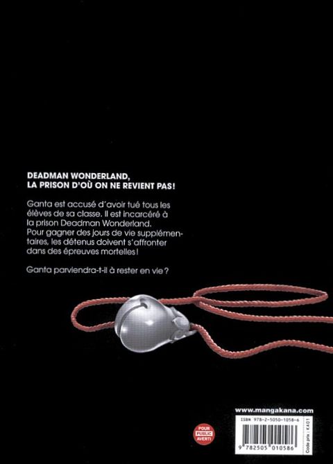 Accusé à tort d'avoir tué tous les élèves de sa classe, Ganta est incarcéré à la prison Deadman Wonderland. Chaque jour les prisonniers participent à des épreuves mortelles pour gagner quelques jours de vie supplémentaires. Ganta doit survivre pour prouver son innocence ! Un shonen à couper le souffl e !