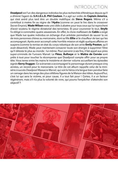 Depuis 2013, Gerry Duggan (Uncanny Avengers) écrit l'histoire de Deadpool. Il y apporte la conclusion dans ce troisième tome. Deadpool a perdu ses alliés et affronté tous ses ennemis. L'univers Marvel souhaite maintenant sa mort. Ça tombe bien ! Wade n'en peut plus et veut mettre un terme à ses aventures.