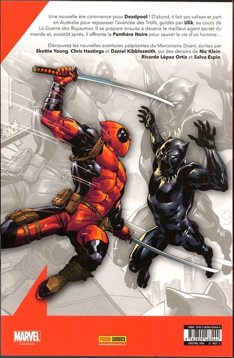 War of the Realms ! Deadpool se jette à son tour dans la Guerre des Royaumes. Retrouvez aussi une mini-série dans laquelle Wade affronte la Panthère Noire ainsi que Domino: Hotshots, avec Black Widow.