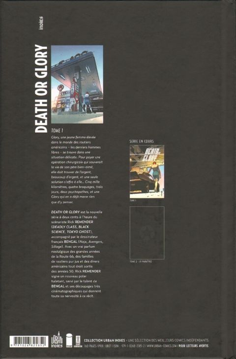 Glory, une jeune américaine élevée dans le monde des routiers américains - les derniers hommes libres - se trouve dans une situation délicate. Pour payer une opération chirurgicale qui sauverait la vie de son père bien-aimé, elle doit trouver de l'argent, beaucoup d'argent, et une seule solution s'offre à elle... Cinq mille kilomètres, quatre braquages, trois jours, deux psychopathes, et une Glory qui en a déjà marre rien que d'y penser. Contenu vo : Death or Glory Volume 1: She's Got You (#1-5).