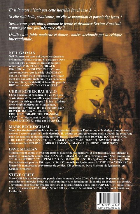 Sexton furnival est aussi blasé qu'un jeune homme de 16 ans (presque et demi) peut l'être. Désabusé et indifférent, il est convaincu d'avoir déjà tout vu, jusqu'à ce qu'il rencontre l'étrange didi. excentrique et enjouée, didi trouve du merveilleux dans les événements les plus anodins. et comme si cela ne suffisait pas à faire douter sexton de sa perception de la réalité. elle affirme également être l'incarnation de la mort. ils embarquent ensemble dans une aventure à travers les rues de new york où ils croisent une vieille vagabonde de 250 ans à la recherche de son coeur et un fou en quête du pouvoir absolu, deux révélations parmi toutes celles qui les attendent. Ecrit par neil gaiman, désigné par le new york times comme le plus grand auteur américain, et illustré par un duo de rêve composé de chris bachalo et mark buckingham, ce conte de fées des temps modernes est une introduction parfaite à la célèbre série sandman. parce qu'entre 16 et 60 ans, et au-delà, personne ne doit oublier le prix et la valeur de la vie.